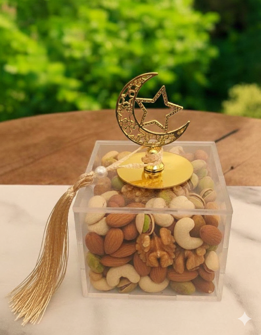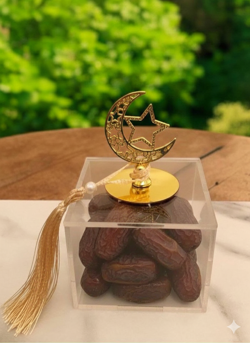 Complete your home’s elegance with a refined touch. This modern marble tray features chic gold accents and comes with two imported acrylic boxes—perfect for serving dates, dried fruits, nuts, and chocolates in a sophisticated way. Finished with crescent and star metal handles to bring the spirit of Ramadan into every detail.